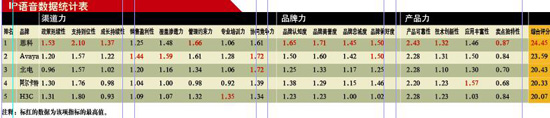 從綜合評分情況來看,思科、Avaya以明顯的優(yōu)勢位列IP語音產(chǎn)品的第一集團,他們的優(yōu)勢非常明顯,幾乎在所有指標(biāo)上都位居前列,而包括北電、阿爾卡特朗訊和H3C在內(nèi)的品牌位列第二集團。
