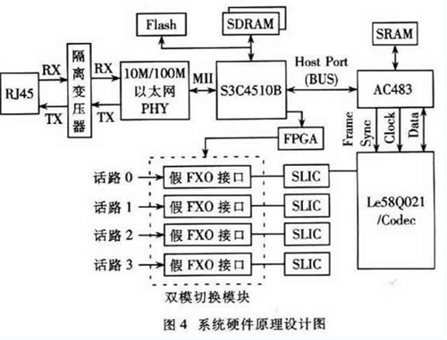 本節(jié)提出了一種基于H.323的雙模網(wǎng)關(guān)的系統(tǒng)設(shè)計方案,該方案支持4路話音,使用一種經(jīng)濟實用的“假FXO接口”方式實現(xiàn)雙模切換,能夠在VoIP通話時檢測到PSTN線上進來的呼叫并可通過按話機的拍簧或者Flash閃斷鍵切換接聽!
