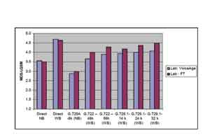 圖2對MOS(平均意見得分)值的分析深刻說明了寬帶是如何被主觀感知的。窄帶G.729A的多數MOS值約為 3.5,而高清語音的MOS值至少比其高出30%,達到4.5。