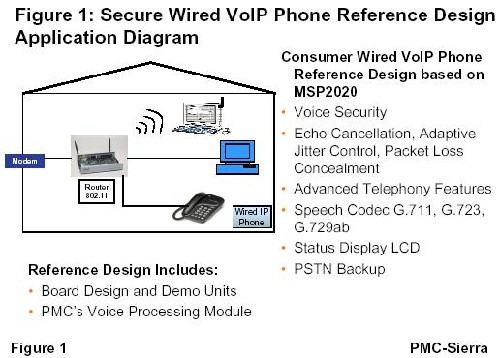 PMC-Sierra的MSP2020是VoIP電話參考平臺的基礎,可以使具備安全特性的VoIP產品在價格和性能上都達到新的高度。MSP2020不需要單獨的處理器、語音處理DSP、安全芯片以及多個以太網MAC,其全集成式設計簡化了電話設計復雜性,使整個產品成本(BOM)減少,可以讓OEM與服務提供商迅速向市場提供差異化VoIP電話產品。