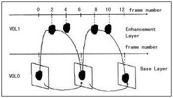 時域可擴展性編碼通常是通過在碼流中添加B幀來實現(xiàn)的。B幀是使用與它在時間上最近鄰的前后兩個I幀或P幀來預測的,而自己并不作為任何其它幀的參考圖像,因此在傳輸中丟棄B幀并不影響其它幀的質量,而僅僅降低幀率。圖1是MPEG-4的時域可擴展性編碼的示意圖。
