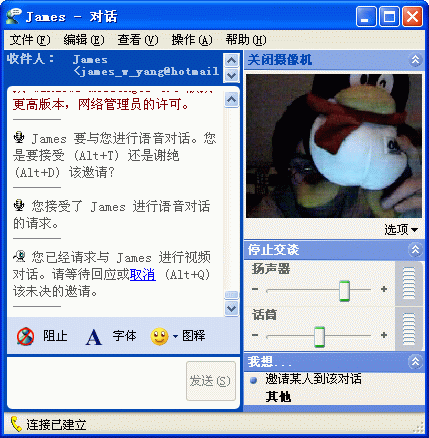 單擊對話框右邊的“啟動攝像機”和“開始交談”,系統(tǒng)會提示你正在等待對方回應(yīng)視頻或語音對話的邀請,對方接受,就開始進(jìn)行視頻通話(見圖11)。如果雙方都有攝像頭,你還可以通過視頻框下面的“選項”將自己的影像設(shè)為畫中畫的功能。