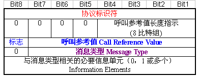 其中的協(xié)議標識符指示消息的參考協(xié)議類型,比如I.451消息的協(xié)議標識符為"00001000";呼叫參考值用于指示消息所控制的B信道上哪一呼叫,該值由發(fā)起呼叫的一側(cè)進行分配,且和某一特定呼叫相關(guān)的所有消息都附帶了這個值。