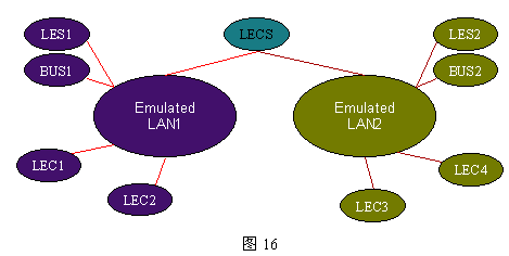 每個ELAN(Emulated LAN)由一組LANE客戶(LEC)和LANE服務構成。LEC還可以是作為ATM主機代理的網(wǎng)橋和路由器。LE服務由三個不同的功能實體構成:LAN仿真配置服務器(LECS)、LAN服務器(LES)和BUS,這三個服務實體可以各自存在,但通常位于同一設備,例如:LES可以位于ATM交換機、路由器、網(wǎng)橋和工作站。ATM LANE的構成及相互關系如下圖16所示: