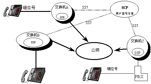 縮位撥號(hào)是指用一短的撥號(hào)(如三位)代替一長的撥號(hào)(如八位)的撥號(hào)方案。如下圖所示的智能網(wǎng)中,交換機(jī)A、B、C所有用戶的撥號(hào)方案數(shù)據(jù)都由SCP管理,當(dāng)交換機(jī)收到用戶的縮位撥號(hào)后,通過SS7鏈路訪問SCP數(shù)據(jù)庫,返回對(duì)應(yīng)的電話號(hào)碼,然后交換機(jī)通過公網(wǎng)把呼叫接通到該電話號(hào)碼,就和用戶直接撥打該電話號(hào)碼一樣。