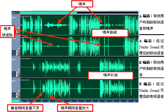 這里的結(jié)果顯示出,PSTN側(cè)收聽(tīng)器接收到的噪音是如何被大大降低的,同時(shí)PSTN側(cè)說(shuō)話的音量在無(wú)線側(cè)出現(xiàn)大聲的噪音期間被顯著地放大了。通過(guò)遍及全球的類(lèi)似場(chǎng)合試驗(yàn),在應(yīng)用Studio Sound之前和應(yīng)用之后通話質(zhì)量的不同已經(jīng)深刻為許多業(yè)務(wù)提供商所了解。