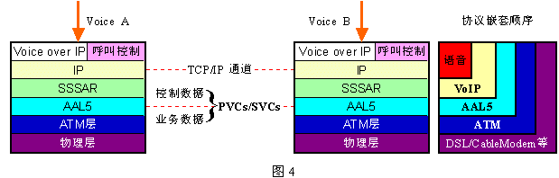 除了上面的LES外,還可以通過AAL5進行話音傳送。下圖4為其協(xié)議模型。實質上這是通過兩次映射完成的:首先進行的是VoIP技術,之后把這些語聲IP包通過IPoATM(LANE)傳送?雌饋硭坪踹^于羅嗦,但這樣做的目的是充分利用VoIP技術的靈活性和AAL5的優(yōu)點(開銷小、糾錯強,支持多種業(yè)務速率/變速率),也即,它必須建立在ATM網(wǎng)絡的高可靠性和VoIP的充分成熟基礎之上;就目前的技術發(fā)展而言,這兩個條件都已具備了。圖4中的右邊給出了基于AAL5的典型VoATM應用模型。