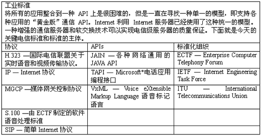 新的標(biāo)準(zhǔn)像是Parlay,VoiceXML和WAP正在重新定義--和開始定義--業(yè)務(wù)提供商的環(huán)境。整個的網(wǎng)絡(luò)結(jié)構(gòu)正在進(jìn)化成一個基于標(biāo)準(zhǔn)模塊,協(xié)議,和編程接口的開放的體系。