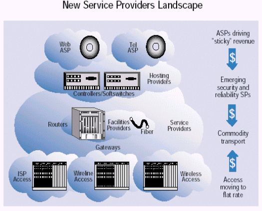 任何一個網(wǎng)絡(luò)的核心都是光纜和讓網(wǎng)絡(luò)工作起來的底層交換設(shè)備。傳統(tǒng)的業(yè)務(wù)提供商就是那些擁有這種底層設(shè)備的公司。但是打破傳統(tǒng)的語音環(huán)境為那些沒有這些底層設(shè)備的組織打開了向商業(yè)客戶和消費者提供服務(wù)的大門。這種趨勢--網(wǎng)絡(luò)傳輸從電路交換轉(zhuǎn)變?yōu)榉纸M交換以及隨時可得的基于開放部件的劃算的業(yè)務(wù)平臺--使得這些新的業(yè)務(wù)提供商為自己的業(yè)務(wù)找到了商業(yè)機(jī)遇。