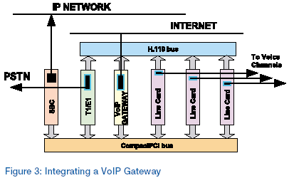 其它新業(yè)務(wù),例如IP話(huà)音(VoIP),如果要達(dá)到理想的性能,就需要電信系統(tǒng)內(nèi)部的集成,增加一塊網(wǎng)關(guān)板卡,作為附屬在CompactPCI總線(xiàn)和H.110總線(xiàn)上的外圍設(shè)備。現(xiàn)在,有了額外硬件(網(wǎng)關(guān)板卡)和VoIP的額外軟件,充分利用VoIP性能就成為可能(圖3)。