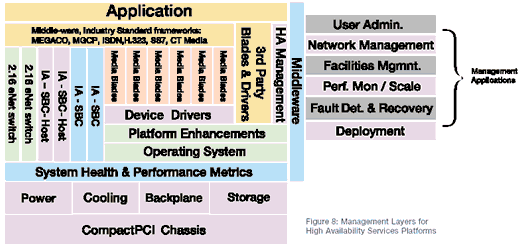 圖8展示了管理層的外觀,它兼容PICMG 2.16的CompactPCI平臺。在較低的水平上,系統(tǒng)的健康和性能度量標(biāo)準(zhǔn)通過平臺的可替換單元(FRUs)和中間設(shè)備之間互相通信的平臺性能提升得以實現(xiàn)。HA管理軟件層提供健康和性能方面的度量標(biāo)準(zhǔn)和最高層管理應(yīng)用之間的通信。