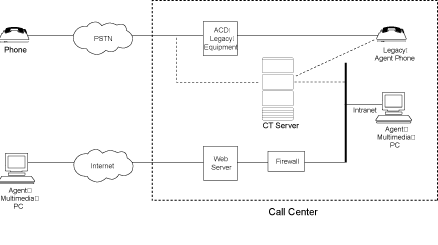 連接到傳統(tǒng)的ACD上. 主叫方的信息例如IP地址, Email地址等被傳送的哦CTI服務(wù)期. CTI服務(wù)期可以用這些信息去客戶(hù)數(shù)據(jù)庫(kù)中進(jìn)行查詢(xún), 影響到座席代表的路由,