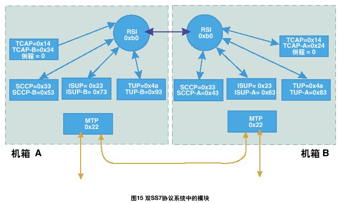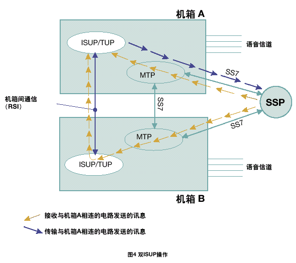 一個雙ISUP/TUP系統(tǒng)通過激活每個機(jī)箱中的一半電路協(xié)議狀態(tài)機(jī)進(jìn)行工作。每個ISUP/TUP層通過本地MTP3發(fā)送所有的傳送流量。本地MTP3采用與相鄰SS7節(jié)點(diǎn)之間的本地鏈路進(jìn)行傳輸,如果該鏈路發(fā)生故障,則采用機(jī)箱之間的SS7鏈路。