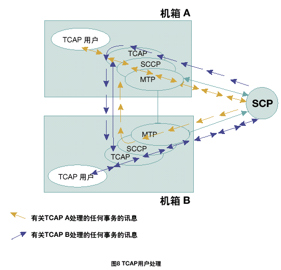 每個TCAP將所有接收的信息傳遞到同機(jī)箱中的TCAP用戶任務(wù)中。根據(jù)每一個TCAP中不同的應(yīng)用層或用戶,將TCAP層的本地應(yīng)用程序發(fā)送的傳送會話和組件原語傳遞給正確的TCAP。在雙系統(tǒng)環(huán)境中,接收訊息可以在任何MTP和SCCP層上共享;因此,一個TCAP層接收由其它TCAP處理的應(yīng)用在激活事務(wù)上的TCAP訊息是可能的。