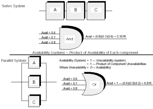 由于冗余被引入系統(tǒng),系統(tǒng)的可用特性發(fā)生了重大的改變。實用性計算變成了一種費(fèi)力并且容易出錯的工作,因為計算必須考慮冗余的效果,失效切換到冗余組件的成功率,MTTR失效組件的效率及相似的問題。使用平臺和電話板塊MTTF數(shù)據(jù)作為輸入和使用可靠模塊圖(RBD)2以正確決定系統(tǒng)級別可用特性可以獲得更好的結(jié)果。