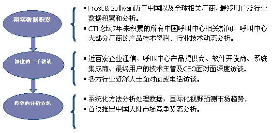 Frost & Sullivan 和 CTI論壇(fuchaizy.com)共同組成的調(diào)研小組,在查閱了大量資料的基礎(chǔ)之上,以企業(yè)通信及呼叫中心的設(shè)備應(yīng)用、投資計(jì)劃以及相關(guān)廠商的市場表現(xiàn)為出發(fā)點(diǎn),通過對(duì)企業(yè)通信及呼叫中心重要應(yīng)用企業(yè)、在市場占主導(dǎo)地位的二十多家設(shè)備廠商、二十多家軟件開發(fā)商、十幾家系統(tǒng)集成商、數(shù)家外包運(yùn)營商的深度訪談,參閱內(nèi)部相關(guān)報(bào)告及數(shù)據(jù)庫,對(duì)數(shù)據(jù)的來源和數(shù)據(jù)的準(zhǔn)確性進(jìn)行了詳細(xì)核對(duì)與論證;憑借參與調(diào)研人員的多年從業(yè)經(jīng)