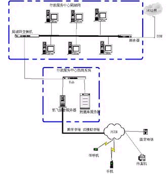 政府群眾一線通”系統(tǒng)可以通過局域網(wǎng)連入行政中心局域網(wǎng)交換機,從而實現(xiàn)與整個行政服務(wù)中心的信息共享和熱線系統(tǒng)服務(wù)內(nèi)容的自動更新。具體網(wǎng)絡(luò)拓?fù)浣Y(jié)構(gòu)如下:
