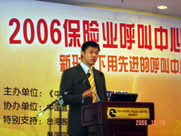 。。2006年10月18日,2006保險(xiǎn)業(yè)呼叫中心應(yīng)用暨電話營銷高峰研討會在北京天鴻科園大酒店隆重召開,以下是大會主題演講的相關(guān)圖片報(bào)道: