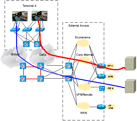 這種部署在新近的大型機場中可以找到。該客戶利用ONS 15252在雙DWDM 核心上部署了MPLS/VPN 和 SONET服務。他們采用Cisco