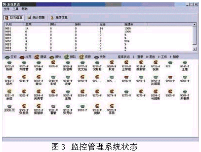 攜程呼叫中心每天話務(wù)量非常大,因此每個相關(guān)部門、小組都有專人對呼叫中心的實時情況進行監(jiān)測,如圖3所示。在這個實時監(jiān)控工具的畫面上,不僅可以看到每個隊列的當前狀況(包括總數(shù)、排隊數(shù)、振鈴數(shù)、應(yīng)答數(shù)、接通率)、當前的通話及座席的統(tǒng)計信息,而且可以監(jiān)控每個隊列中所有操作員的工作情況及電話機的狀態(tài),做到所有情況一目了然。這個工具還能根據(jù)部門、小組的不同情況進行設(shè)置,使每個部門、小組的主管只看到自己部門的情況。