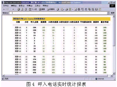 攜程呼叫中心在設(shè)計之初原本要選用Avaya的呼叫記錄系統(tǒng)BCMS(基本呼叫管理系統(tǒng))或CMS(呼叫管理系統(tǒng)),但是經(jīng)過研究發(fā)現(xiàn),BCMS的功能較少,而且對數(shù)據(jù)的保存方式和保存周期有一定的限制;而CMS需要專用的服務(wù)器和軟件,成本較高。因此,攜程公司自行開發(fā)了一套基于數(shù)據(jù)庫的呼叫記錄管理系統(tǒng),將每個呼入、呼出電話的詳細情況全部記錄在數(shù)據(jù)庫中,并且結(jié)合報表生成系統(tǒng),制作了各種呼叫中心的實時報表和統(tǒng)計分析報表;同時,利用數(shù)據(jù)倉庫技術(shù)對這些數(shù)據(jù)進行分析、挖掘,為呼叫中心的運行、管理提供了強有力的支持。圖4為呼叫中心呼入電話實時統(tǒng)計報表,可及時統(tǒng)計每個小時電話呼入數(shù)、接通數(shù)、平均通話時間、接通率等重要數(shù)據(jù)。