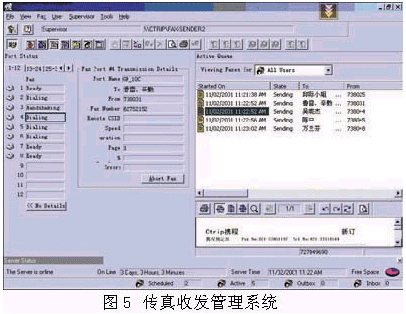 攜程呼叫中心的傳真量非常大,在設(shè)計、實施傳真系統(tǒng)過程中,通過采用多種技術(shù)組合,實現(xiàn)了較為先進、自動的傳真收發(fā)管理系統(tǒng),如圖5所示。