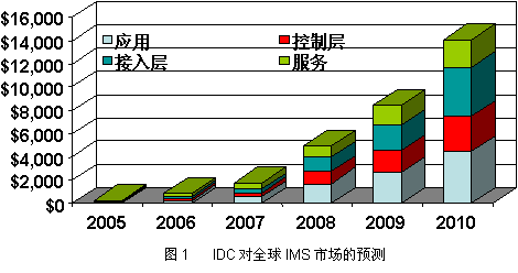 IMS作為一個(gè)通信架構(gòu),開創(chuàng)了全新的電信商業(yè)模式,拓展了整個(gè)信息產(chǎn)業(yè)的市場(chǎng)空間。IMS正在成為新一輪的投資熱點(diǎn)。IDC認(rèn)為,IMS市場(chǎng)將從目前的數(shù)百萬美元迅速增長(zhǎng)到2010年的141億美元(如圖1)。對(duì)于電信行業(yè)來說,IMS的意義甚至超出了3G或4G,它將重新定義未來的通信業(yè)務(wù)。