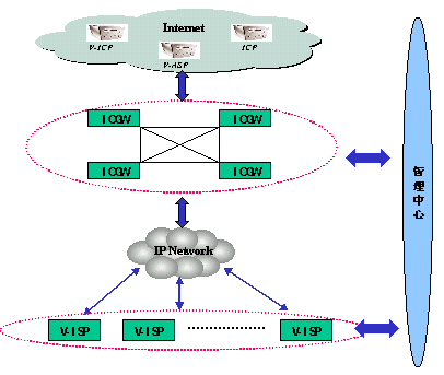 整個語音互聯(lián)網(wǎng)由V-ISP接入服務平臺、ICGW信息控制關口、V-ICP內(nèi)容提供平臺、管理平臺四部分組成。這四部分分別完成不同的功能。