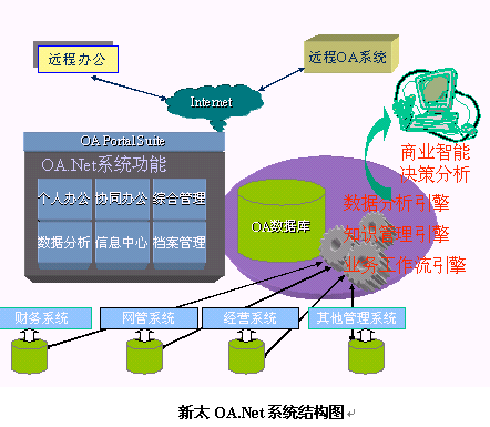 新太OA.Net系統(tǒng)基于最新的B/S三層體系結(jié)構(gòu)開(kāi)發(fā),采用關(guān)系型數(shù)據(jù)庫(kù)(SQL Server,Oracle等)結(jié)合群件系統(tǒng)(Exchange、Domino等)的方式,在保證系統(tǒng)高穩(wěn)定性的基礎(chǔ)上充分發(fā)揮了系統(tǒng)的靈活性?蛻(hù)端基于瀏覽器,無(wú)需安裝軟件,版本自動(dòng)更新到客戶(hù)端,大大降低了系統(tǒng)維護(hù)的難度。