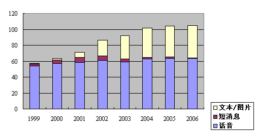 從2002年開(kāi)始,用戶在數(shù)據(jù)服務(wù)上花費(fèi)的增幅將超過(guò)話音服務(wù)上花費(fèi)的減幅。我們估計(jì)2006年的平均用戶收入將達(dá)到38美元,在個(gè)體用戶方面,收入大部分來(lái)自WAP服務(wù)。在商務(wù)用戶市場(chǎng),WAP服務(wù)使用量會(huì)比較低,主要來(lái)自互聯(lián)網(wǎng)介入,內(nèi)聯(lián)網(wǎng)接入以及文件下載,遠(yuǎn)程控制和移動(dòng)專業(yè)人士是這方面的應(yīng)用的主要促進(jìn)因素。我們預(yù)計(jì)隨著話音服務(wù)競(jìng)爭(zhēng)加劇以及價(jià)格下幅,月平均用戶收入將穩(wěn)步下降,相反地,在數(shù)據(jù)服務(wù)方面的月平均用戶收入將在預(yù)測(cè)期內(nèi)上升。