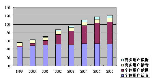 表1-5顯示了1999~2006年平均用戶收入數(shù)據(jù),包括個(gè)體用戶平均用戶收入、商務(wù)用戶平均用戶收入以及總體平均用戶收入