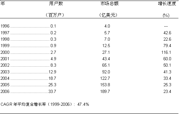 圖一: 美國寬帶接入服務市場的增長歷史和預測 1996-2006