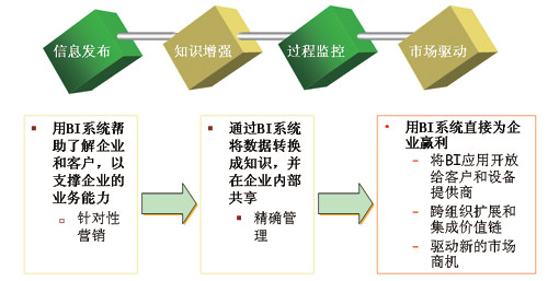 所謂BI,是商業(yè)智能的簡稱,是綜合利用各種查詢、統(tǒng)計、分析挖掘技術,分析解決企業(yè)運營過程中發(fā)生的問題。BI應用演進過程中,逐步從被動發(fā)現(xiàn)問題到及時監(jiān)控預防問題,更高級的階段是通過分析預測市場/企業(yè)發(fā)展的趨勢,主動觸發(fā)有利事件以推動企業(yè)的發(fā)展。