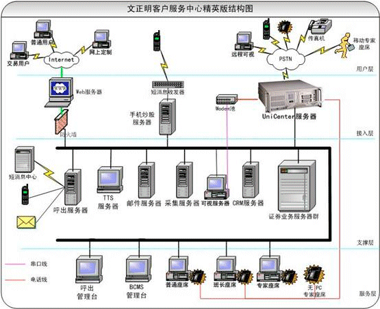 泰陽(yáng)證券有客戶2萬多,相當(dāng)一部分要通過電話委托程序作交易。原有電話委托系統(tǒng)是模擬線。交易忙時(shí),很多股民打不進(jìn)去。以前的業(yè)務(wù)相對(duì)也比較簡(jiǎn)單。文正明公司在了解了泰陽(yáng)方面的業(yè)務(wù)需要后,用公司的UniCenter系統(tǒng)和深圳東進(jìn)公司的ISDN數(shù)字卡、傳真卡和座席卡,為泰陽(yáng)搭建了一個(gè)新的語(yǔ)音應(yīng)用平臺(tái)。