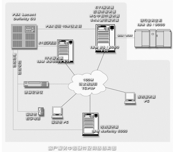 由銀證公司與IBM公司聯(lián)合開(kāi)發(fā)的大規(guī)模銀行客戶(hù)服務(wù)中心系統(tǒng)。該系統(tǒng)基于朗訊DEFINITY程控交換機(jī)和IBM客戶(hù)服務(wù)系統(tǒng)開(kāi)發(fā)平臺(tái),開(kāi)通200外線,120線電話銀行自動(dòng)應(yīng)答,50線人工座席服務(wù)和12路傳真服務(wù)。