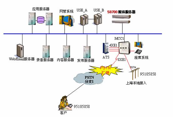 1、采用AVAYA的S8700作為排隊系統(tǒng),MCC1作為媒體網(wǎng)關(guān),全國280多個城市的客戶撥打本地電話通過電信網(wǎng)絡(luò)匯接到上海中心;