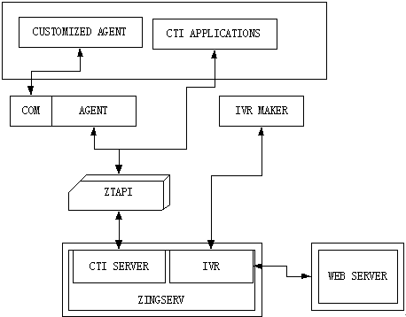 ZINGSERV呼叫中心平臺(tái)封裝了高智能的PABX功能和呼叫中心IVR、ACD特性,同時(shí)集成了CTI Server、系統(tǒng)設(shè)置功能。ZINGSERV提供的開發(fā)接口包括IVR生成器和ZTAPI(Zinglabs Telephony Application Program Interface),Agent軟件和Monitor軟件就是利用ZTAPI開發(fā)出來的。