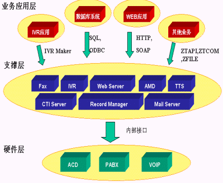 SQL Server,MySQL等多種數(shù)據(jù)庫;通過HTTP調(diào)用第三方WEB程序,通過SOAP協(xié)議調(diào)用Web Server上的服務(wù),從而利用外部應(yīng)用進(jìn)一步加強(qiáng)IVR的功能;用戶只需做一些簡單配置就可以實現(xiàn)電話訪問數(shù)據(jù)庫、WEB和業(yè)務(wù)系統(tǒng)。如圖所示: