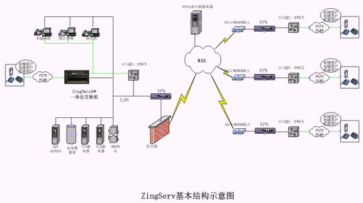 硬件:中心點有ZingSwitch®,O口網(wǎng)關和內(nèi)線卡,VPN動態(tài)注冊服務器和VPN設備,或GK服務器。座席端配置S口網(wǎng)關,根據(jù)需求配置相應的VPN設備。