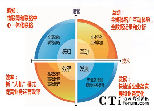 這是“感•動中心”的主旨,完全以客戶的業(yè)務(wù)為出發(fā)點,體現(xiàn)“以客戶為中心”的理念。而“全景中心”、“聯(lián)絡(luò)中心”等以純技術(shù)為中心,還停留在多媒體通訊和UC通訊手段融合層面,只是新增加了一些新方式的接入等技術(shù),對于客戶業(yè)務(wù)的融合和適應(yīng),并沒有任何提升。