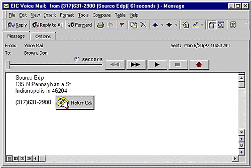 用戶A看見MWI燈亮,撥打x3000。Interaction Mail接到從內(nèi)線x1234來的說明直撥電話的SMDI消息,Interaction Mail應(yīng)答電話,要求用戶A輸入密碼,用戶A聽完新消息后,Interaction Mail在Exchange中為消息附加一個(gè)讀過標(biāo)識(shí),發(fā)送一個(gè)SMDI消息關(guān)掉用戶A的電話MWI。A用戶還可以用遠(yuǎn)程電話檢索消息。這時(shí),Interaction Mail在密碼之外還要求輸入一個(gè)被分配的內(nèi)線號(hào)碼。使用了Interaction Mail,發(fā)信者可以把語音郵件發(fā)給任意的PBX用戶(操作員等)。而且,用戶A可以從PC機(jī)的電子郵件應(yīng)用程序(如,Microsoft Exchange或者Outlook)存取語音郵件(以及電子郵件和傳真)。