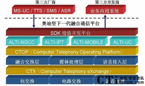 強(qiáng)雄飛:首先,從技術(shù)標(biāo)準(zhǔn)上,奧迪堅(jiān)具有獨(dú)一無二的CTX(Computer Telephony Exchange)技術(shù)標(biāo)準(zhǔn),完全自主知識產(chǎn)權(quán)的融合交換技術(shù),可以將IP包交換、電路交換及語音處理的機(jī)制融合在一起,可以將IP-PBX與CTI功能的核心融合?梢詫(shí)現(xiàn)完全無縫融合的應(yīng)用,將IP語音處理與模擬語音處理統(tǒng)一地在一個(gè)系統(tǒng)上實(shí)現(xiàn),將呼叫中心應(yīng)用與辦公電話應(yīng)用有機(jī)地整合在一起。