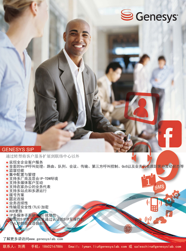 Genesys是世界領先的客戶服務和聯(lián)絡中心軟件供應商------百分百致力于改善客戶體驗,讓人們擺脫糟糕的客戶服務。Genesys以獨特的定位,幫助全球80個國家的2000多家公司,整合員工資源,企業(yè)視角和客戶渠道,來驅動創(chuàng)新的客戶溝通方式。Genesys 軟件每天引導1 億多名客戶進行交互,從聯(lián)絡中心到后臺辦公室,提升整體客戶體驗。Genesys 軟件還能夠幫助企業(yè)避免客戶不滿、提高企業(yè)效率、促進業(yè)務創(chuàng)新,并有效利用資源。