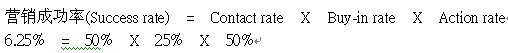 rate(接觸率,能夠聯(lián)系到客戶的比率), Buy-in rate(接受率,聯(lián)系到的客戶里面表達(dá)有興趣的比率), Action rate(成交率,表達(dá)有興趣的客戶里面真正付錢購買的比率)。一般而言,接觸率能達(dá)到50%算是不錯(cuò)的名單,而接受率能達(dá)到25%算是產(chǎn)品、名單選擇登對,銷售技巧也到位,最后臨門一腳的成交率應(yīng)該要能到50%算是達(dá)標(biāo)了。以下列公式來表達(dá)(標(biāo)準(zhǔn)以上述的比率套用):