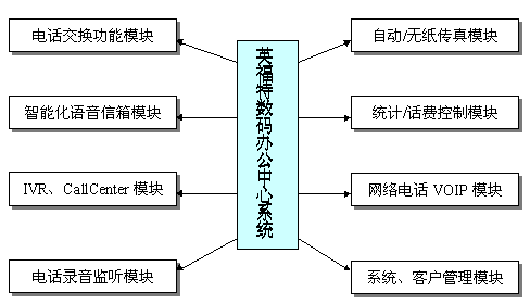 模塊包括:一號(hào)通功能、語(yǔ)音留言、留言通知功能、客戶通過密碼遠(yuǎn)程登錄控制功能、與電子郵件集成的語(yǔ)音郵件(Voice Mail)系統(tǒng)、群組廣播功能等功能。