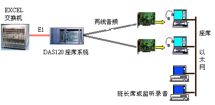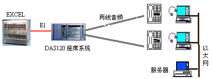 因為EXCEL交換機(jī)不能提供模擬接口。DAS120的出現(xiàn)很好地彌補(bǔ)了其不足。它與EXCEL交換機(jī)采用4個E1連接,可以簡潔實現(xiàn)PCM信號轉(zhuǎn)模擬信號引出到座席。E1接口的信令可選配為隨路信令CAS和透明通道Clear