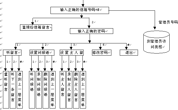 作為信箱主人的用戶既可以象其它普通用戶一樣進(jìn)行普通用戶訪問(指訪問其它分機(jī)、給其它分機(jī)主人留言等),還可以使用系統(tǒng)專門提供的主人訪問服務(wù)功能。