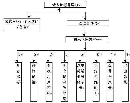 4). 主人密碼:信箱主人訪問自己信箱的口令。主人可以通過(guò)訪問自已的信箱修改密碼,若主人忘記密碼可通過(guò)管理員將其設(shè)置為缺省值0000。