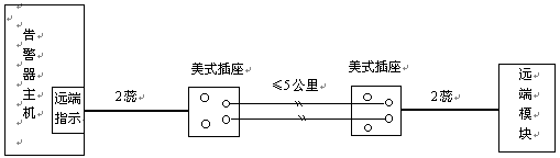 見(jiàn)下圖,遠(yuǎn)端模塊與告警主機(jī)通過(guò)二蕊電話(huà)線相連,連線距離可達(dá)5公里,連接不分極性,可正接或反接