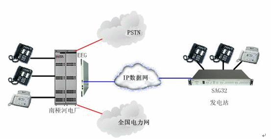 說明:南椏河電廠在現(xiàn)有的IP網(wǎng)絡(luò)基礎(chǔ)上,利用IP中繼網(wǎng)關(guān)EEG與SAG32電信級(jí)模擬VoIP網(wǎng)關(guān)實(shí)現(xiàn)交換機(jī)的遠(yuǎn)程放號(hào),實(shí)現(xiàn)了發(fā)電站與電廠、省電力網(wǎng)、電信等的組網(wǎng),解決了實(shí)際的通信問題。在方案中,具有組網(wǎng)簡單,維護(hù)方便,通話質(zhì)量高等特點(diǎn),得到當(dāng)?shù)赜脩舻恼J(rèn)可。